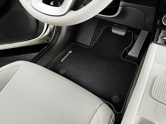 Велюрові килимки ECONYL® виготовлені з матеріалу, отриманого з морських рибальських сіток. Ці високоякісні килимки такі ж зручні та пружні, як і звичайні велюрові килимки. Вони виготовлені спеціально для ідеального розміщення в просторі для ніг і утримуються на місці стандартними точками кріплення та протиковзкою підкладкою. Килимки переднього ряду мають вишитий логотип Hyundai. Набір із 4 шт.
